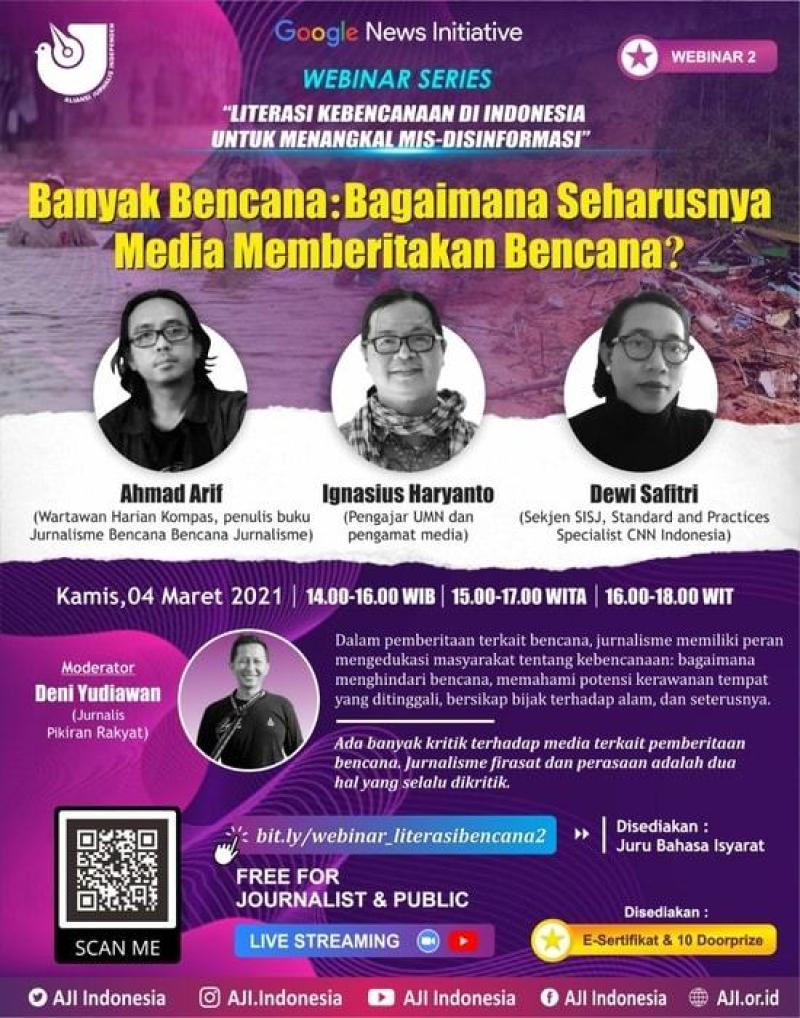 Aliansi Jurnalis Independen (AJI) dengan dukungan Google News Initiative (GNI) kembali menyelenggarakan rangkaian webinar bertema "Literasi Kebencanaan di Indonesia untuk Menangkal Mis-Disinformasi".