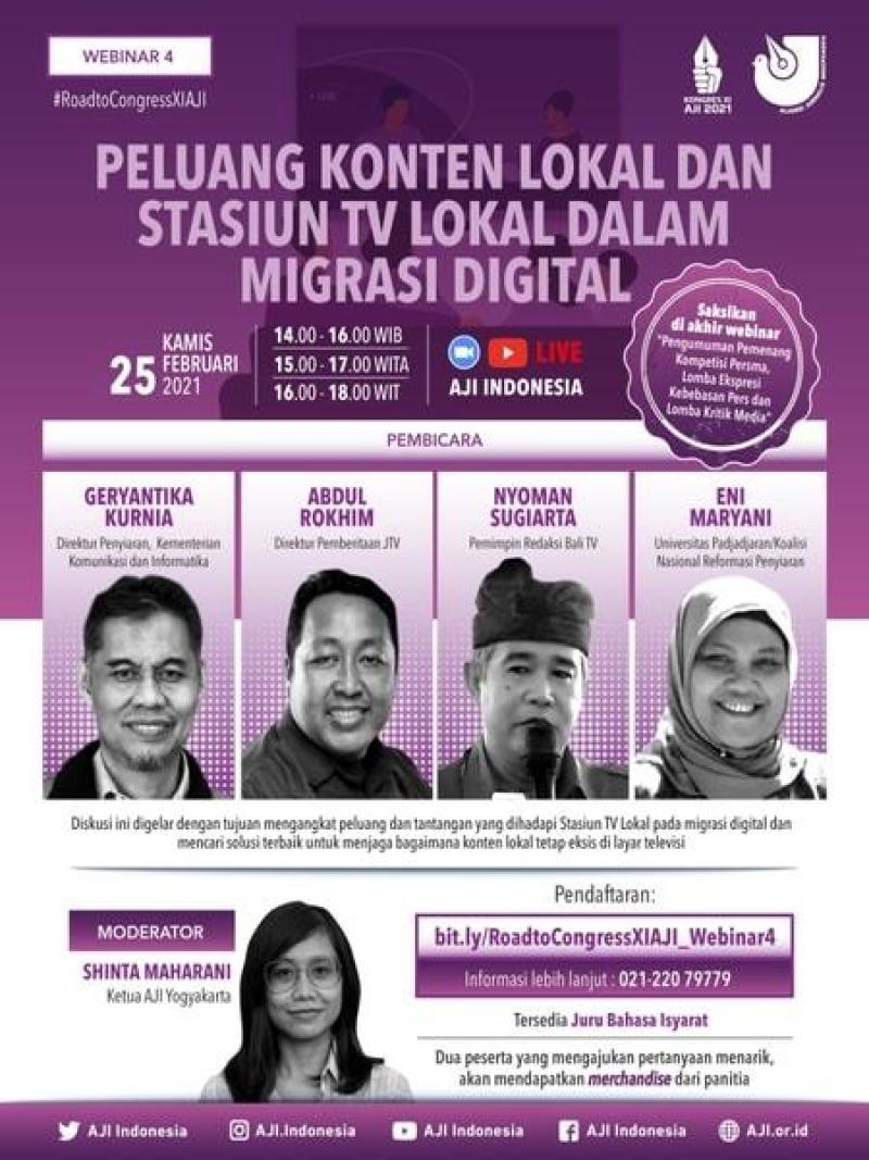 AJI Indonesia menyelenggarakan Webinar publik ke-4 dengan tema “Peluang Konten Lokal dan Stasiun TV Lokal dalam Migrasi Digital” yang akan diselenggarakan pada :