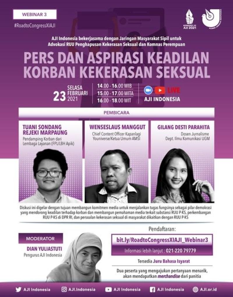 AJI Indonesia bekerjasama dengan Jaringan Masyarakat Sipil untuk Advokasi RUU Penghapusan Kekerasan Seksual dan Komnas Perempuan menyelenggarakan Webinar publik ke-3 dengan tema “Pers dan Aspirasi Keadilan Korban Kekerasan Seksual” yang akan diselenggarakan pada :