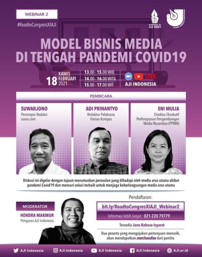 AJI menyelenggarakan Webinar publik ke-2 dengan tema “Model Bisnis Media di Tengah Pandemi Covid19” yang akan diselenggarakan pada :