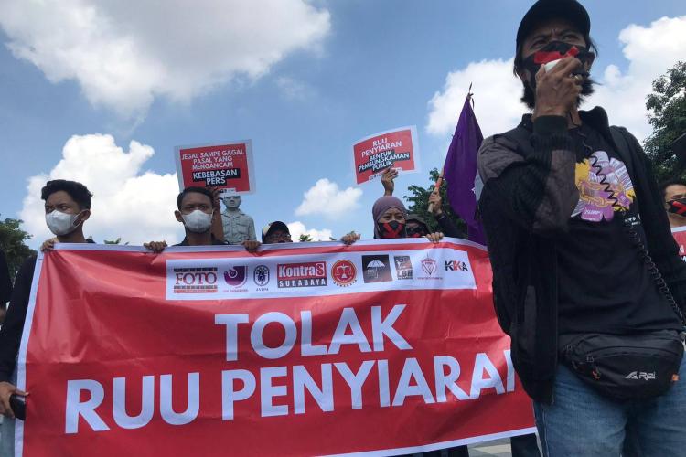 Surabaya, 28 Mei 2024 - Puluhan massa yang tergabung dalam Koalisi Masyarakat dan Pers (Kompres) Tolak RUU Penyiaran Surabaya demo di depan Gedung Negara Grahadi, Surabaya, Selasa (28/5/2024). Mereka