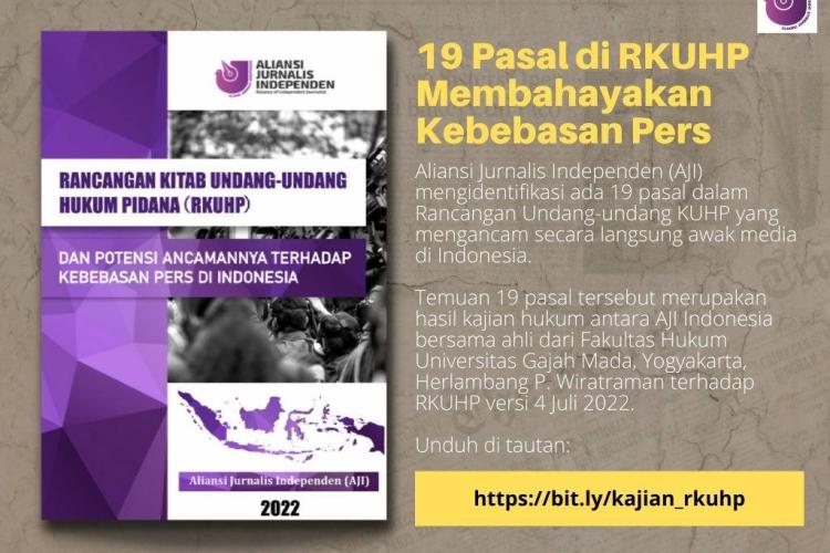 Aliansi Jurnalis Independen (AJI) mengidentifikasi ada 19 pasal dalam Rancangan Undang-undang KUHP yang mengancam secara langsung kebebasan pers di Indonesia. Temuan 19 pasal tersebut merupakan hasil