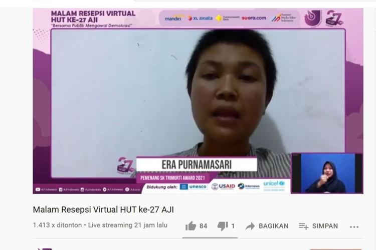 Aliansi Jurnalis Independen (AJI) memberikan SK Trimurti Award 2021 kepada Era purnama Sari, Wakil Ketua Bidang Advokasi Yayasan Lembaga Bantuan Hukum Indonesia (YLBHI). Aktivis perempuan