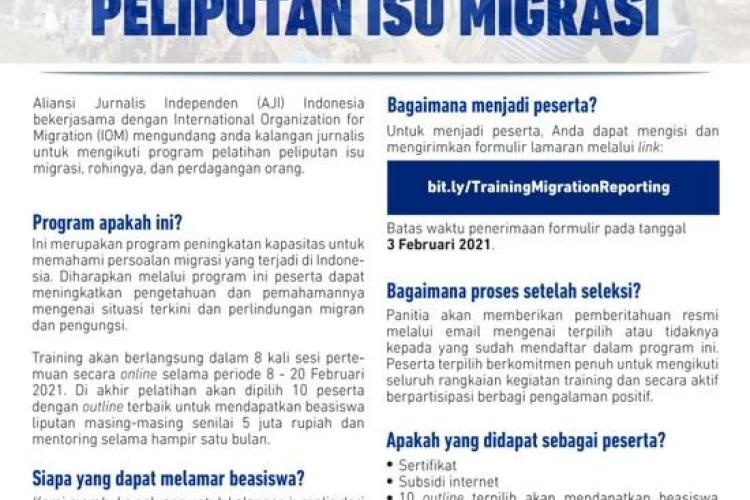 Aliansi Jurnalis Independen (AJI) Indonesia bekerjasama dengan International Organization for Migration (IOM) mengundang anda kalangan jurnalis untuk mengikuti program pelatihan peliputan isu migrasi