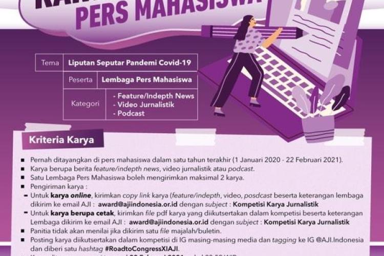 Kompetisi Karya Jurnalistik Pers Mahasiswa Tema: "Liputan Seputar Pandemi Covid-19" Peserta: Lembaga Pers Mahasiswa Kategori: Feature/indepth news Video Jurnalistik Podcast Kriteria Karya: Pernah