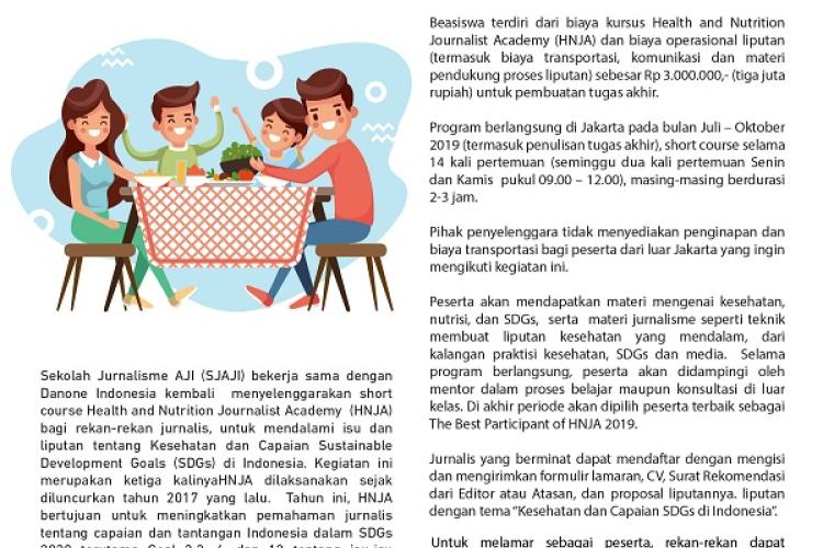 Sekolah Jurnalisme AJI (SJAJI) bekerja sama dengan Danone Indonesia kembali menyelenggarakan short course Health and Nutrition Journalist Academy (HNJA) bagi rekan-rekan jurnalis, untuk mendalami isu