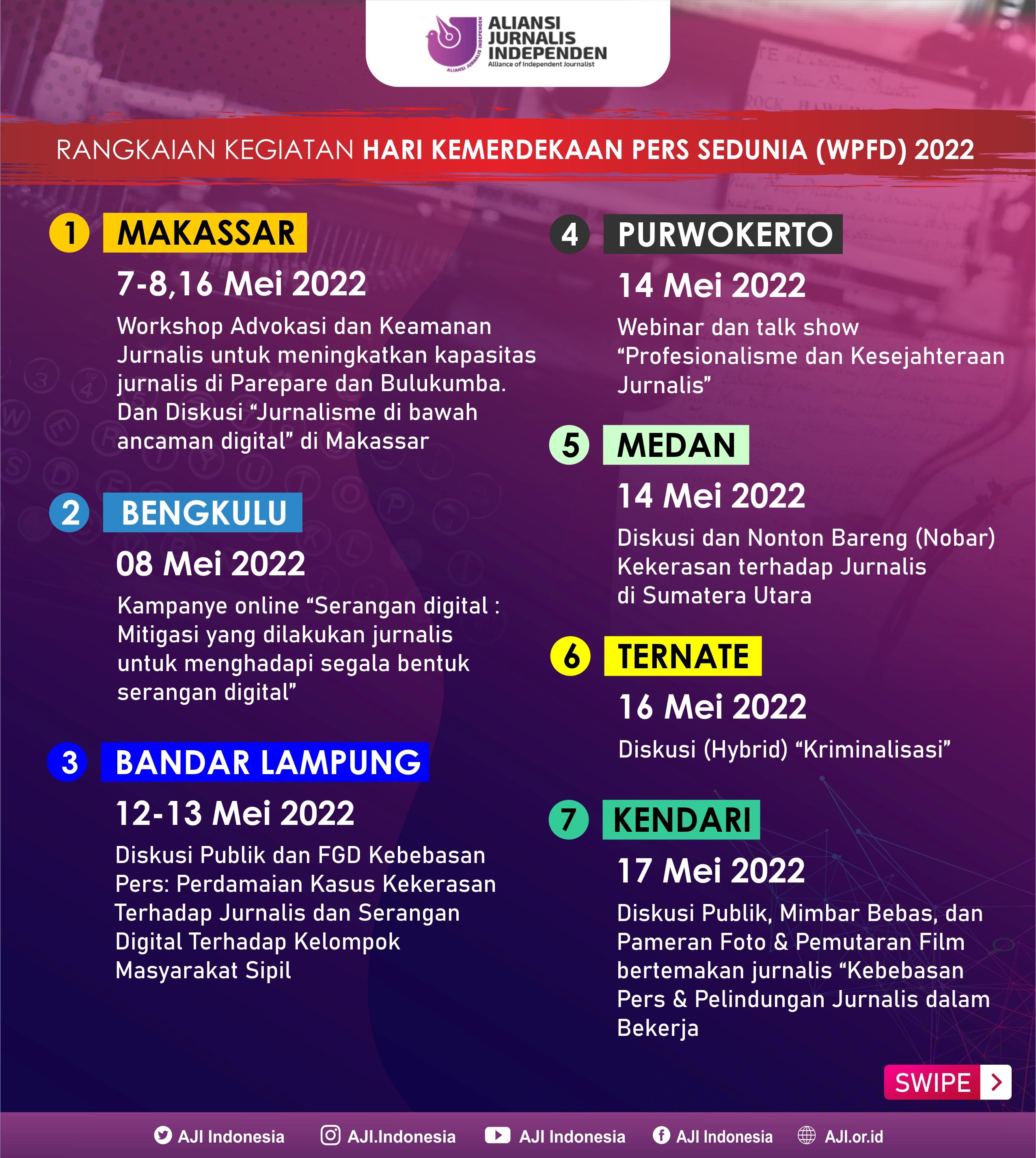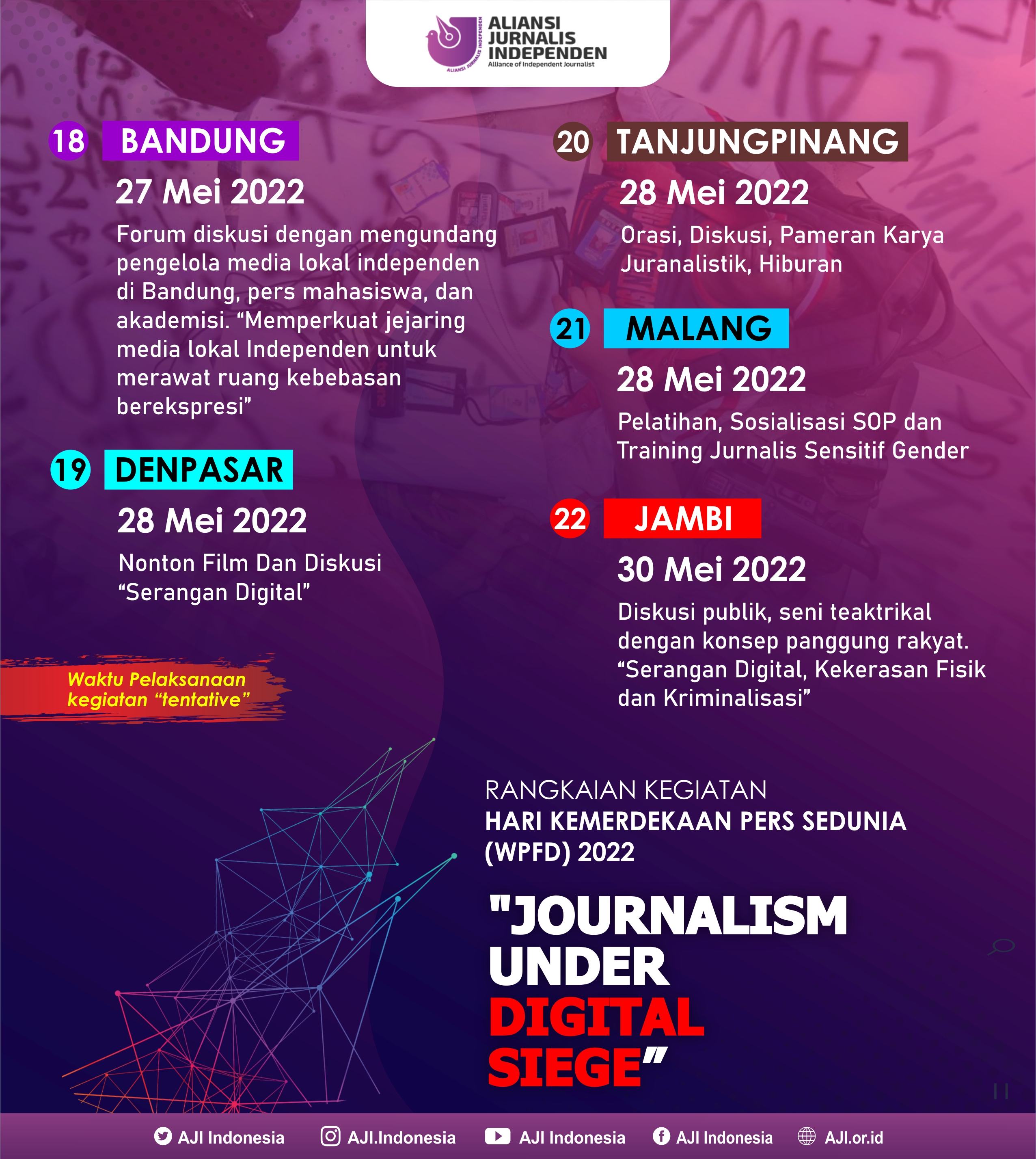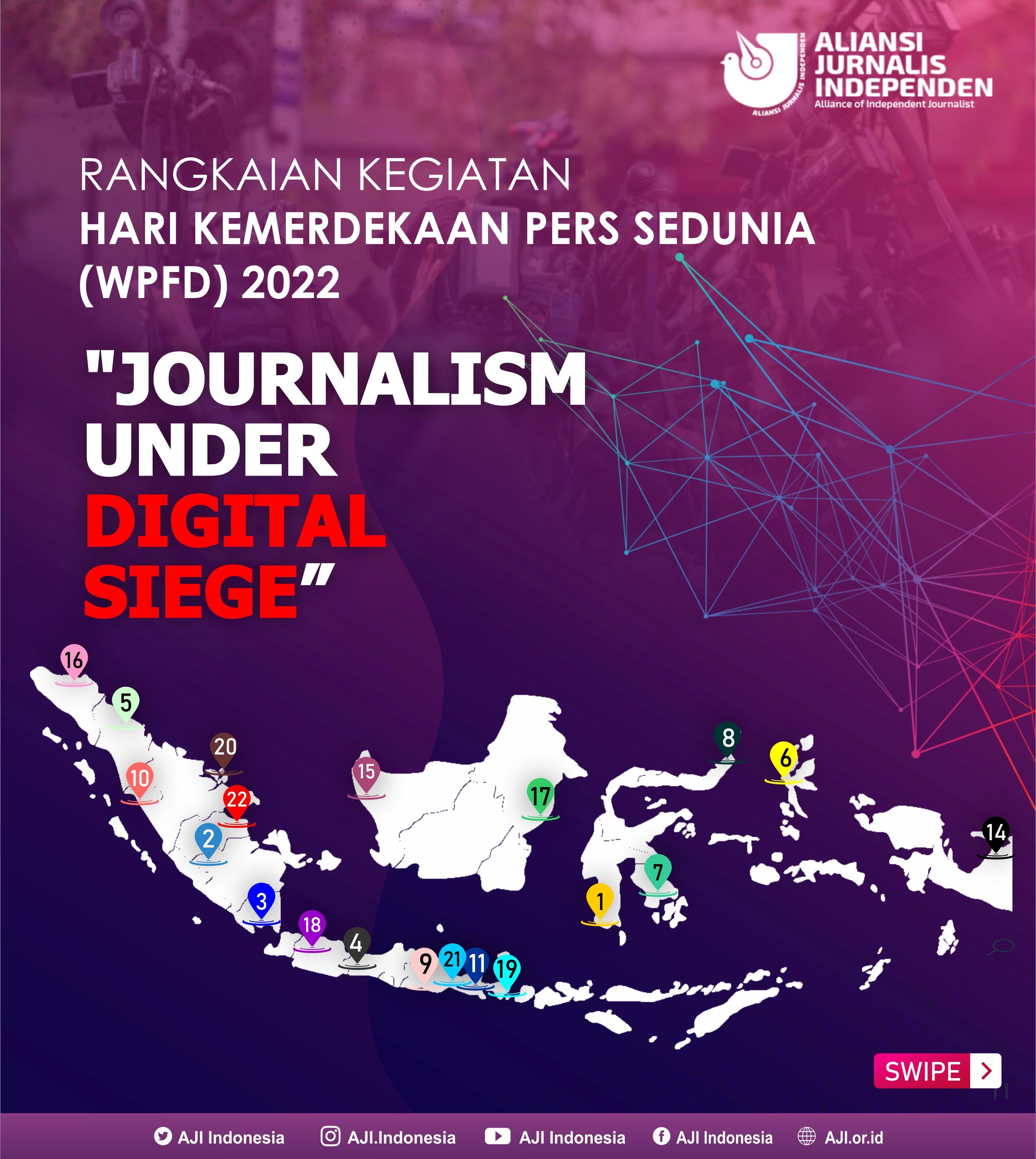 Dalam rangka memperingati Hari Kebebasan Pers Sedunia/World Press Freedom Day (WPFD) 2022, Aliansi Jurnalis Independen (AJI) menyelenggarakan rangkaian kegiatan di 20 kota bertema besar “Journalism Under Digital Siege”.