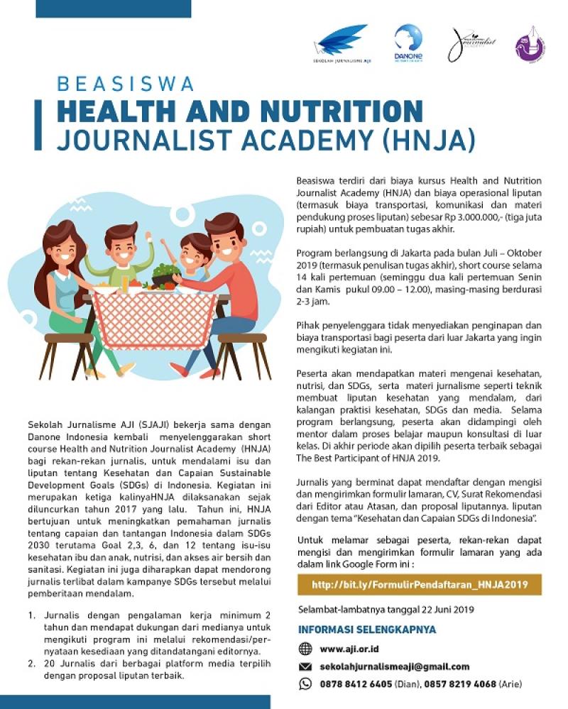 Sekolah Jurnalisme AJI (SJAJI) bekerja sama dengan Danone Indonesia kembali menyelenggarakan short course Health and Nutrition Journalist Academy (HNJA) bagi rekan-rekan jurnalis, untuk mendalami isu dan liputan tentang Kesehatan dan Capaian Sustainable Development Goals (SDGs) di Indonesia. Kegiatan ini merupakan ketiga kalinyaHNJA dilaksanakan sejak diluncurkan tahun 2017 yang lalu. Tahun ini, HNJA bertujuan untuk meningkatkan pemahaman jurnalis tentang capaian dan tantangan Indonesia dalam SDGs 2030 terutama Goal 2,3, 6, dan 12 tentang isu-isu kesehatan ibu dan anak, nutrisi, dan akses air bersih dan sanitasi. Kegiatan ini juga diharapkan dapat mendorong jurnalis terlibat dalam kampanye SDGs tersebut melalui pemberitaan mendalam.
