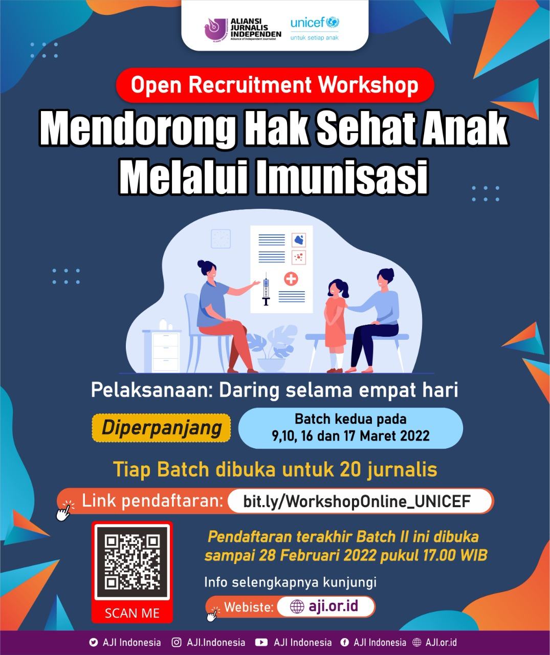 AJI dan UNICEF mengundang jurnalis Indonesia untuk mengikuti kegiatan “Workshop "Mendorong Hak Sehat Anak Melalui Imunisasi" tahun 2022". Kegiatan ini merupakan program peningkatan kapasitas jurnalis untuk memahami prinsip-prinsip hak anak. Serta meningkatkan pengetahuan untuk melakukan pelaporan isu anak, dan bagaimana cara media membantu serta memproteksi dan saling berbagi pengalaman meliput terkait imunisasi.