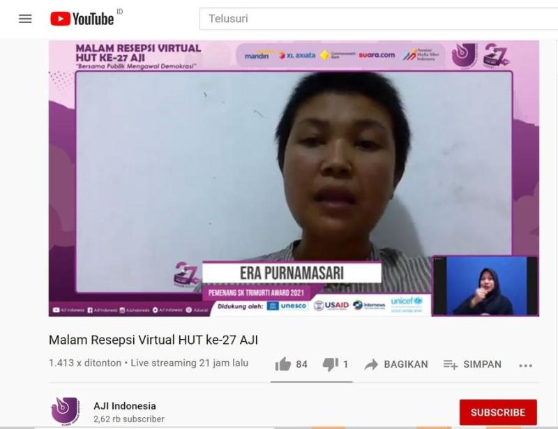 Aliansi Jurnalis Independen (AJI) memberikan SK Trimurti Award 2021 kepada Era purnama Sari, Wakil Ketua Bidang Advokasi Yayasan Lembaga Bantuan Hukum Indonesia (YLBHI). Aktivis perempuan kelahiran 3 Mei 1987 ini memiliki rekam jejak panjang dalam advokasi isu hak asasi manusia (HAM). Penyakit yang diidapnya juga tak menyurutkan semangatnya untuk terlibat dalam advokasi soal kebebasan berekspresi dan menyuarakan perlindungan perempuan melalui kampanye pengesahan Rancangan Undang Undang Penghapusan Kekerasan Seksual.
