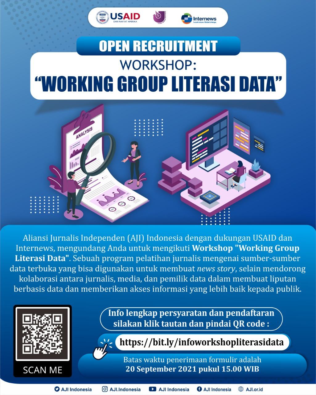 Aliansi Jurnalis Independen (AJI) Indonesia dengan dukungan USAID dan Internews, mengundang Anda untuk mengikuti program Workshop "Working Group Literasi Data". Sebuah program peningkatan kapasitas jurnalis mengenai sumber-sumber data terbuka yang bisa digunakan untuk membuat news story dan membuat liputan berbasis data, serta mendorong kolaborasi antara jurnalis, media, dan pemilik data dalam membuat liputan berbasis data dan memberikan akses informasi yang lebih baik kepada publik. Peserta akan dilatih oleh trainer yang ditunjuk oleh AJI Indonesia.