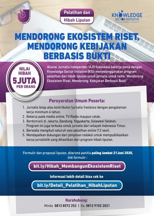 Aliansi Jurnalis Independen (AJI) Indonesia bekerja sama dengan Knowledge Sector Initiative (KSI) menyelenggarakan program pelatihan dan hibah liputan bagi jurnalis untuk mendalami isu serta melakukan pendalam liputan dengan tema “Mendorong Ekosistem Riset, Mendorong Kebijakan Berbasis Bukti”.