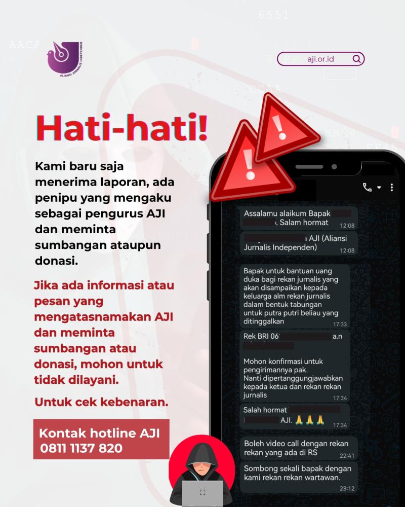 Kawan-kawan, jika ada pesan ataupun informasi yang mengatasnamakan pengurus AJI, mohon tidak direspons dan cek ulang kebenarannya melalui kontak hotline AJI 08111137820.