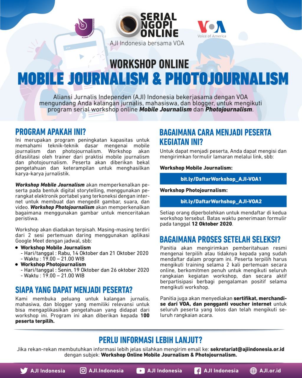 Aliansi Jurnalis Independen (AJI) Indonesia bekerjasama dengan VOA mengundang Anda kalangan jurnalis, mahasiswa, dan blogger, untuk mengikuti program serial workshop online Mobile Journalism dan Photojournalism.