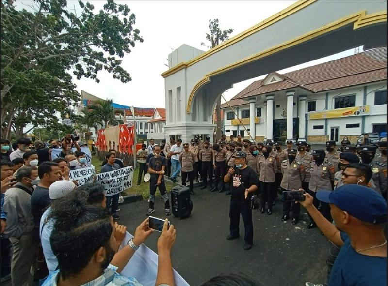 Aksi massa yang digelar pada hari ini buntut tindakan intimidasi oleh salah seorang oknum Kajati Babel kepada salah satu wartawan lokal di Bangka Belitung pada Rabu (27/7/2022) lalu.