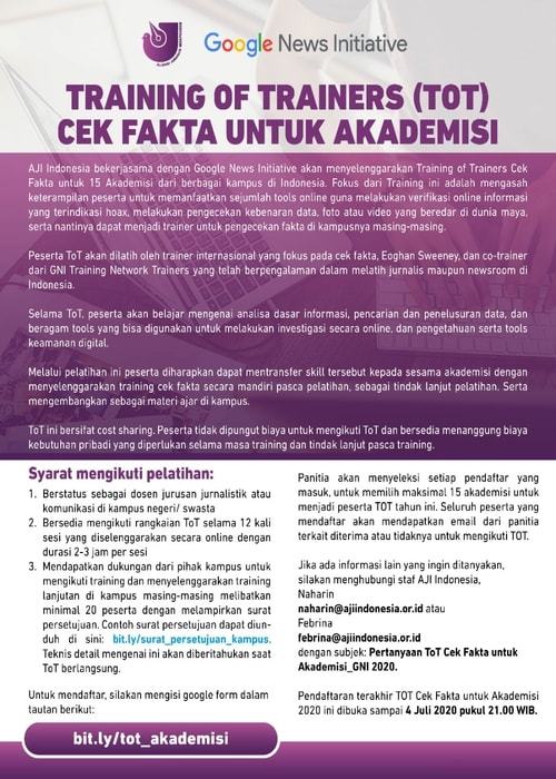 AJI Indonesia bekerjasama dengan Google News Initiative akan menyelenggarakan Training of Trainers Cek Fakta untuk 15 Akademisi dari berbagai kampus di Indonesia. Fokus dari Training ini adalah mengasah keterampilan peserta untuk memanfaatkan sejumlah tools online guna melakukan verifikasi online informasi yang terindikasi hoax, melakukan pengecekan kebenaran data, foto atau video yang beredar di dunia maya, serta nantinya dapat menjadi trainer untuk pengecekan fakta di kampusnya masing-masing.