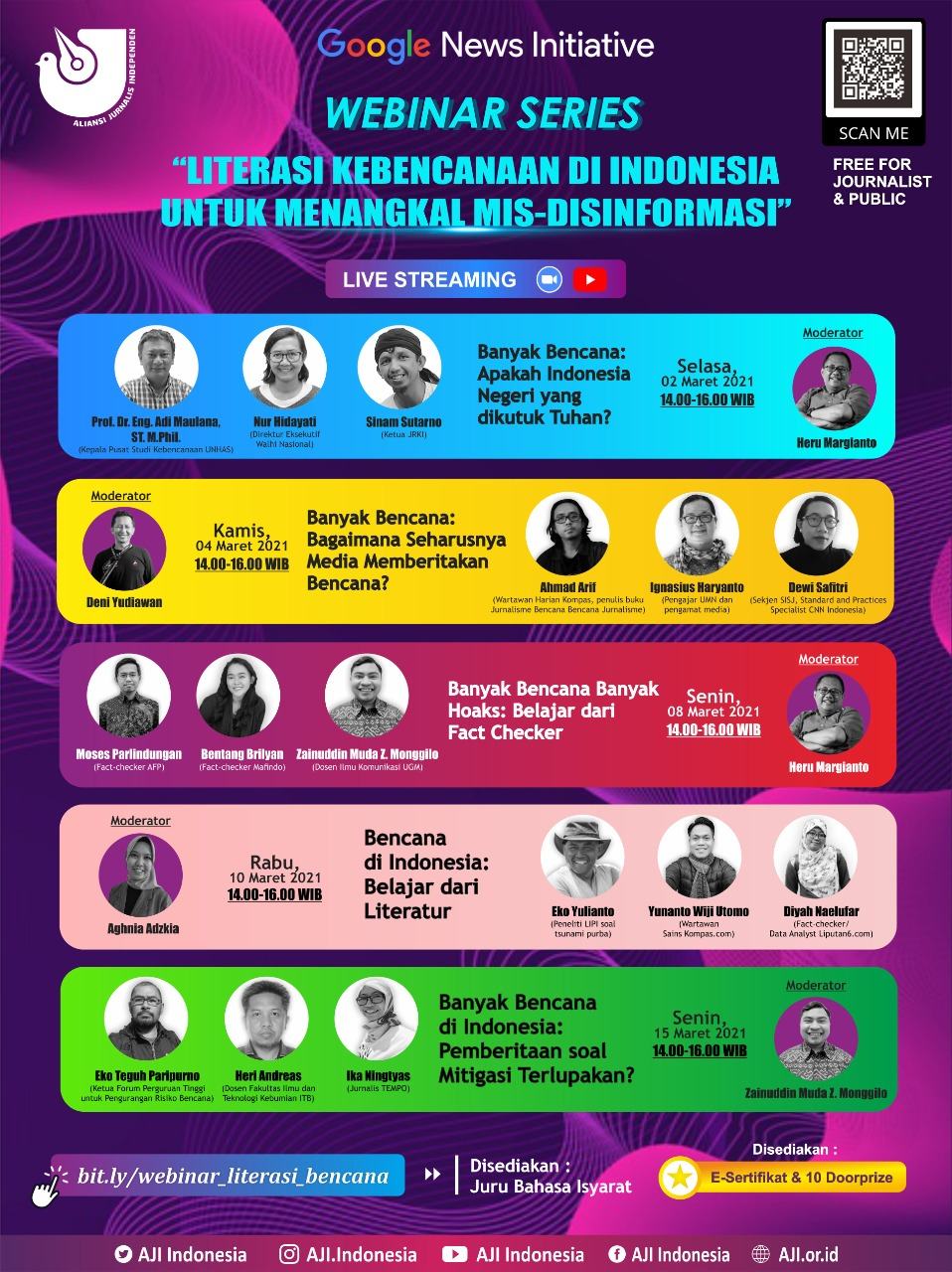 Simak detil tiap webinar di bawah ini dan daftar melalui formulir: bit.ly/webinar_literasibencana